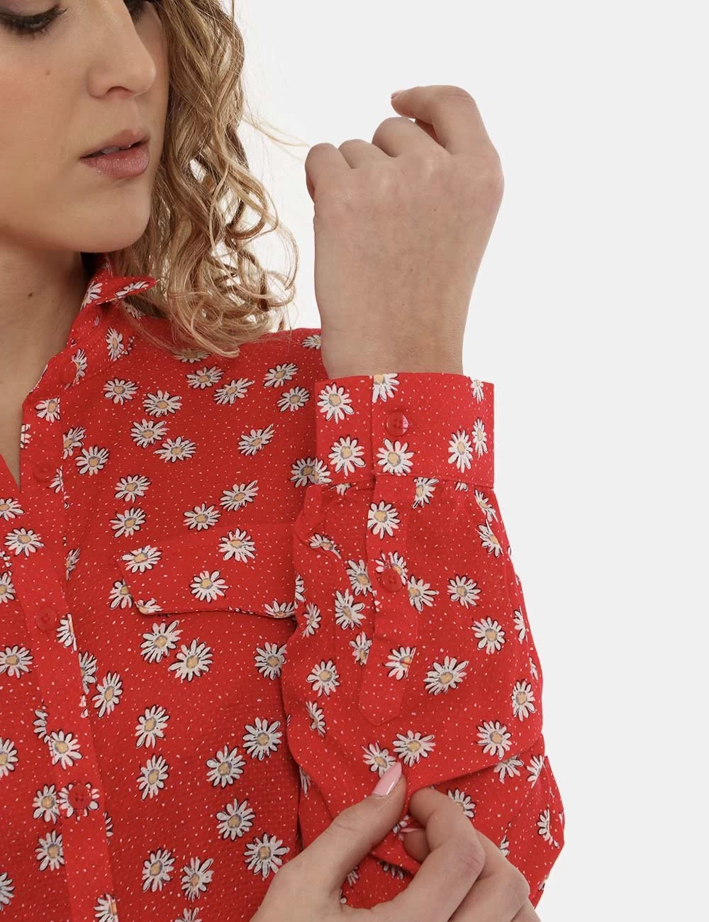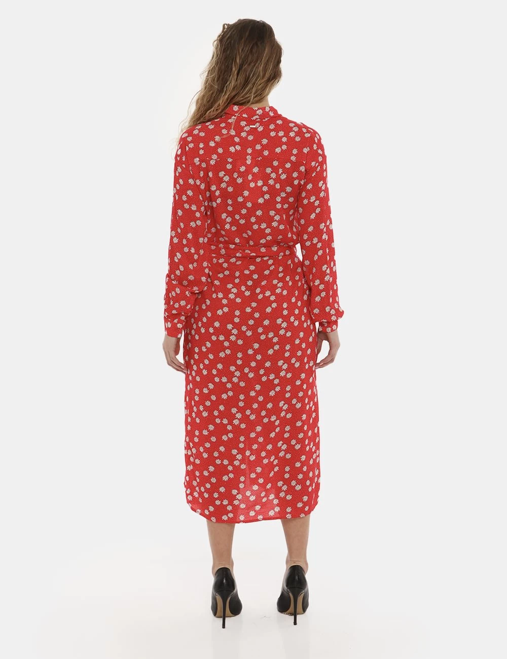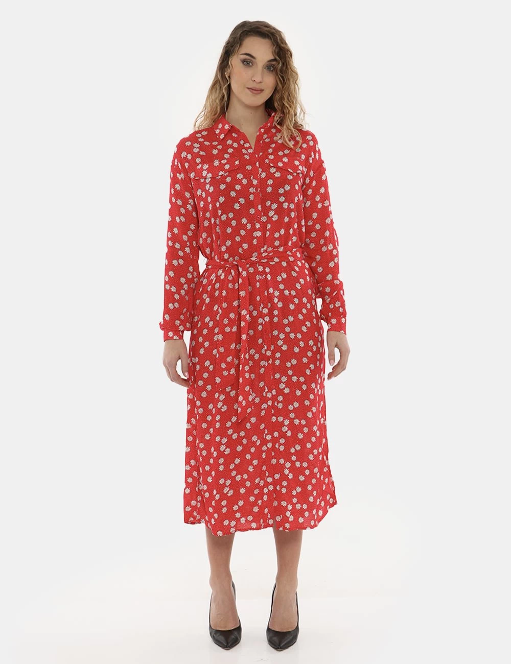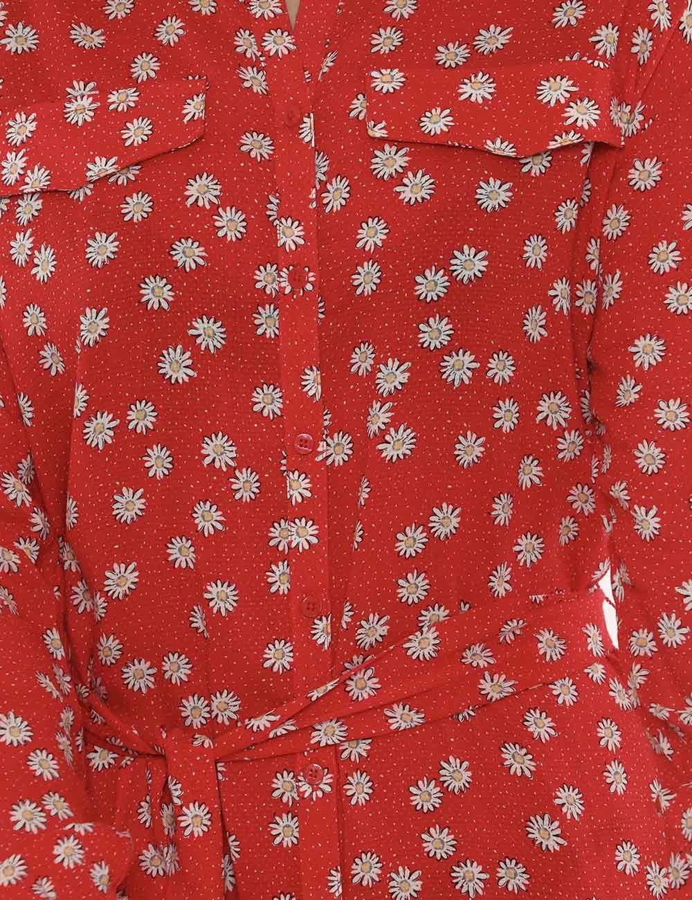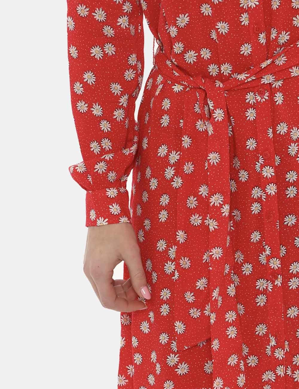 Casual abito lungo a maniche lunghe con polsino su sfondo rosso scarlatto con stampa allover margherite bianche. Presente colletto alla peter pan e dppio spacco laterale. Ulteriore dettaglio è rappresentato da fake tasche applicate ad altezza petto e cinturetta in stoffa in tinta abbinata. La vestibilità è morbida e pratica grazie ad apertura totale sul fronte affidata a bottoni ad asola rossi. L’abito è leggero e ideale per occasioni casual diurne.