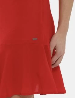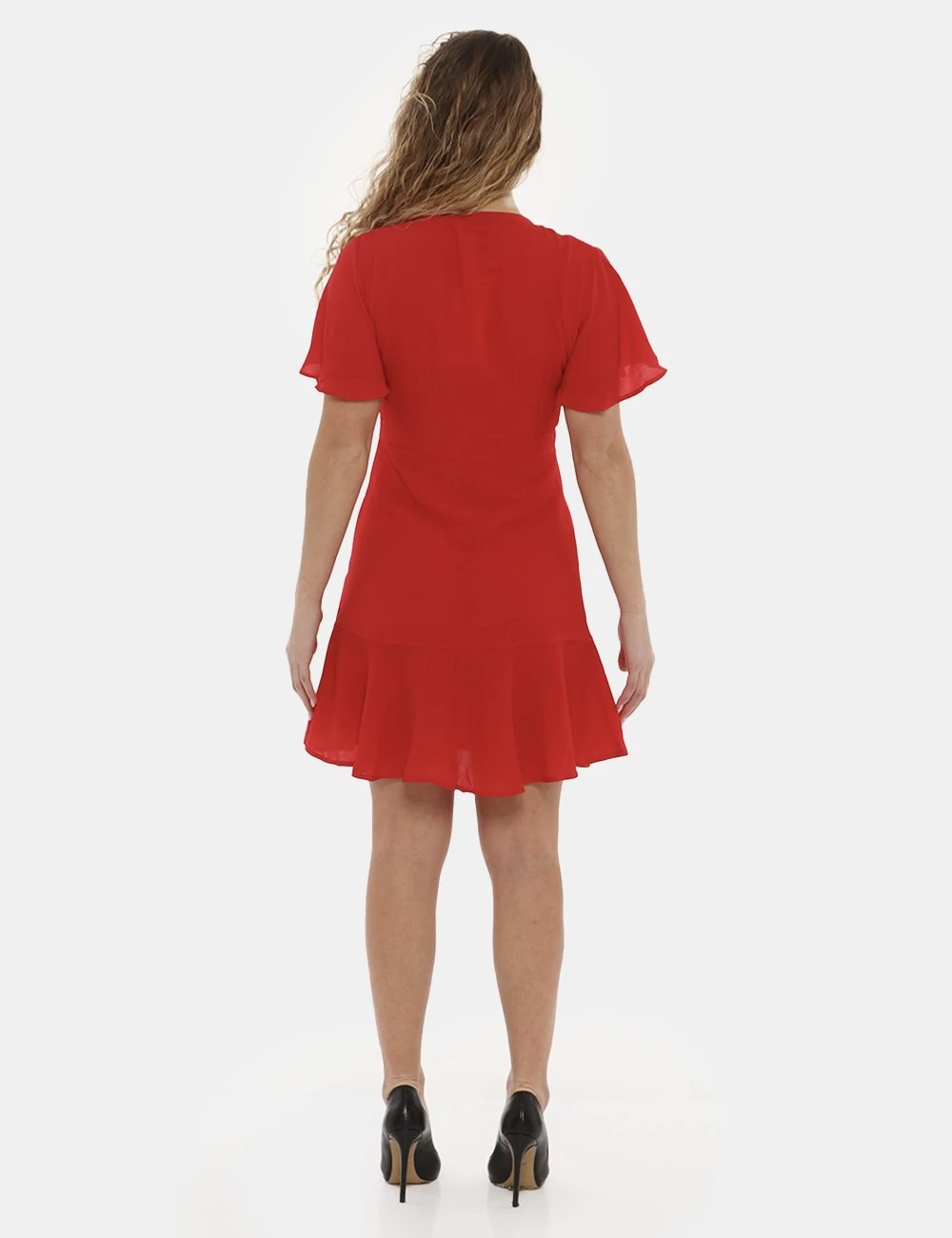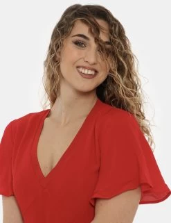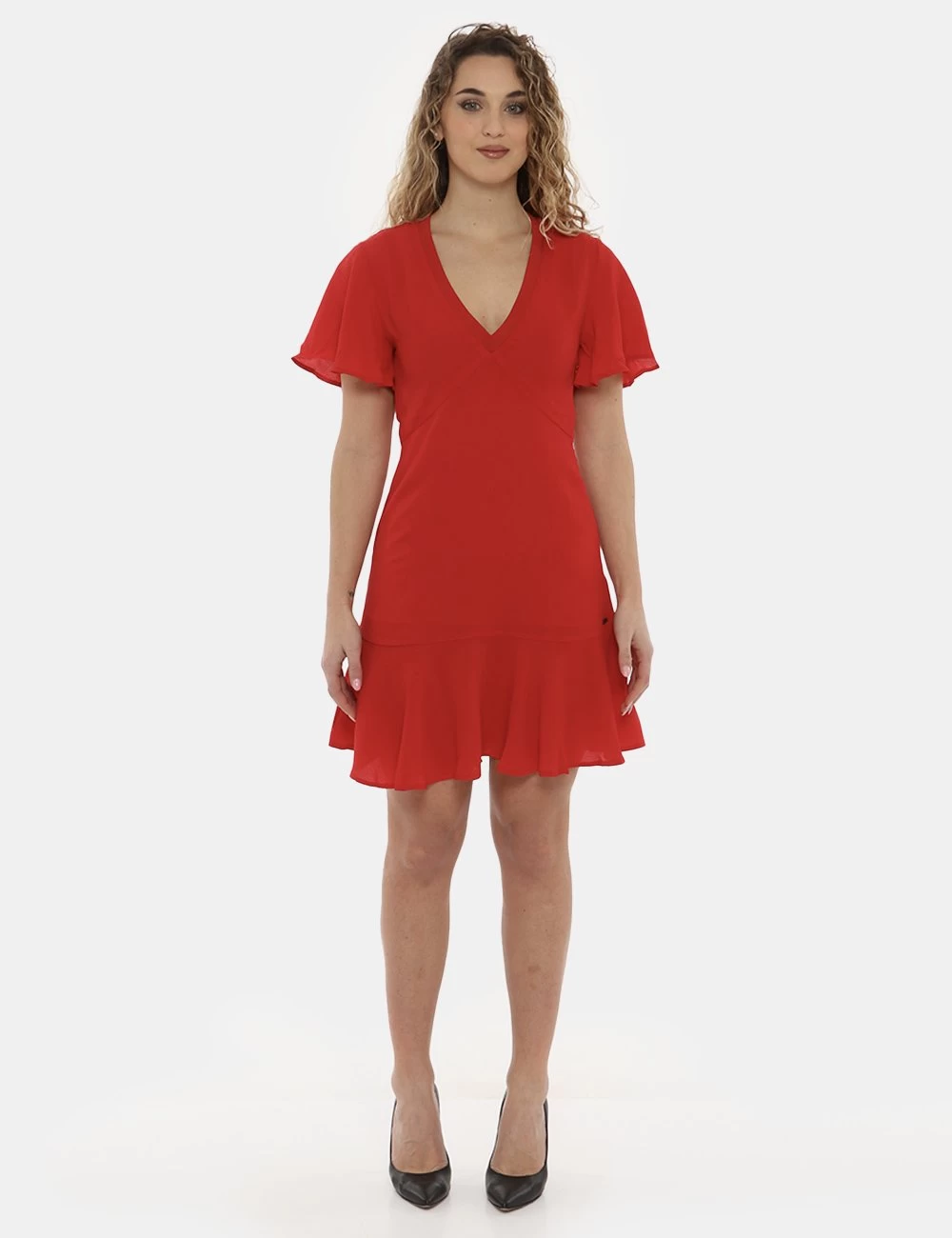 Casual abito con maniche corte svolazzanti e scollo a V in total rosso scarlatto. La vestibilità è morbida e pratica grazie a zip laterale. L’abito è ideale per occasioni casual e diurne ma anche serali se abbinato ai giusti accessori