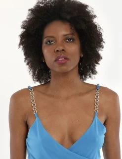 Abito lungo in total azzurro tonalità turchese con scollo ampio e taglio incrociato. Presente taglio trasversale sulla gonna più spalline strette regolabili arricchite da glitter argentati che donano luce al capo. Il vestito è adatto per occasioni raffinate e ideale per outfit serali. Preparati alle vibrazioni del fine settimana.