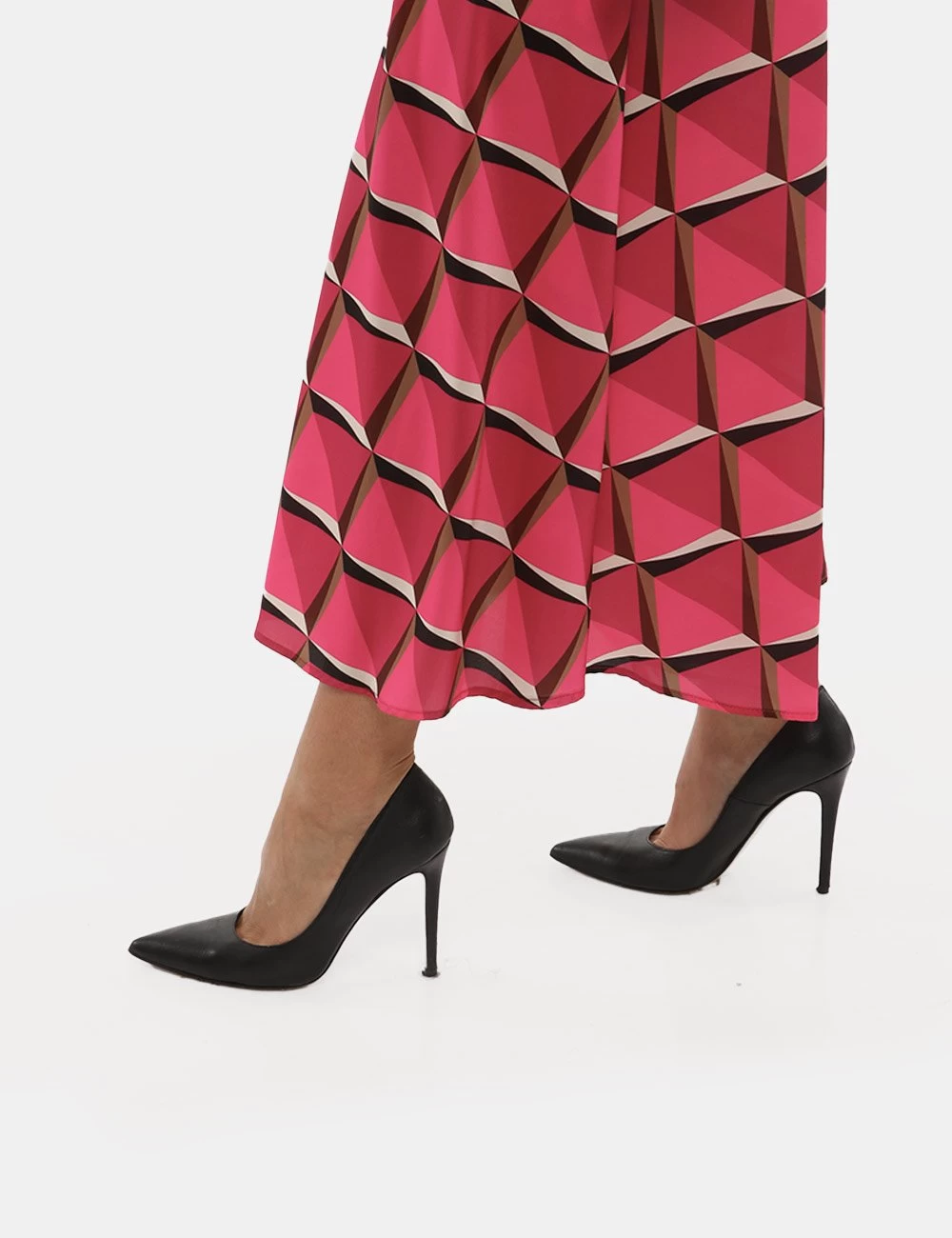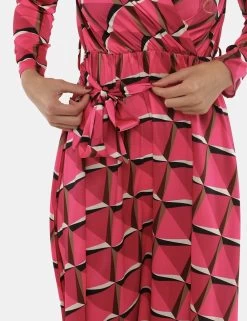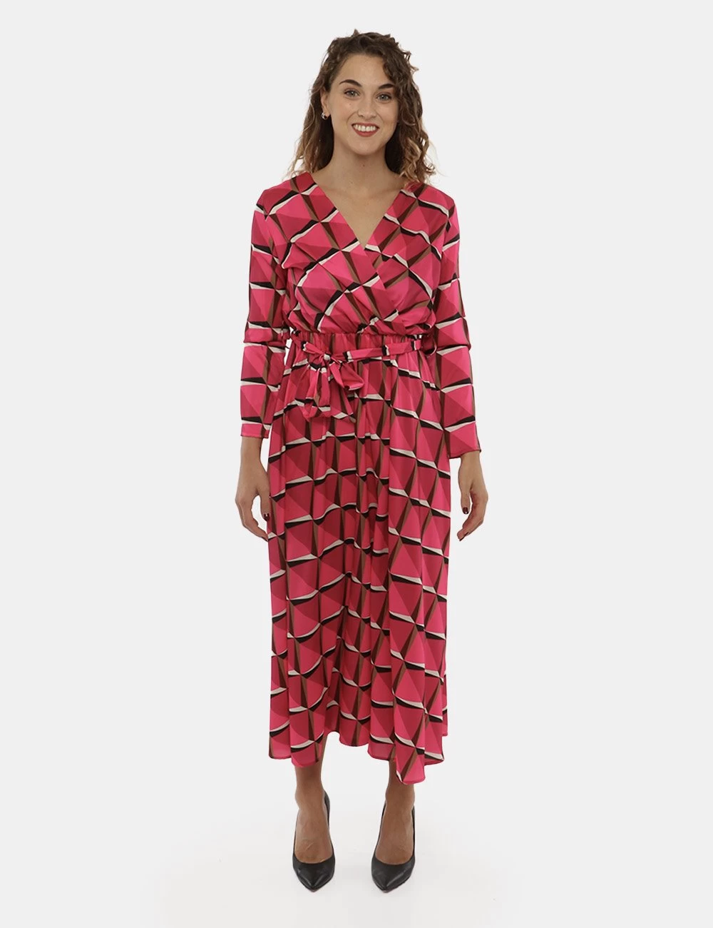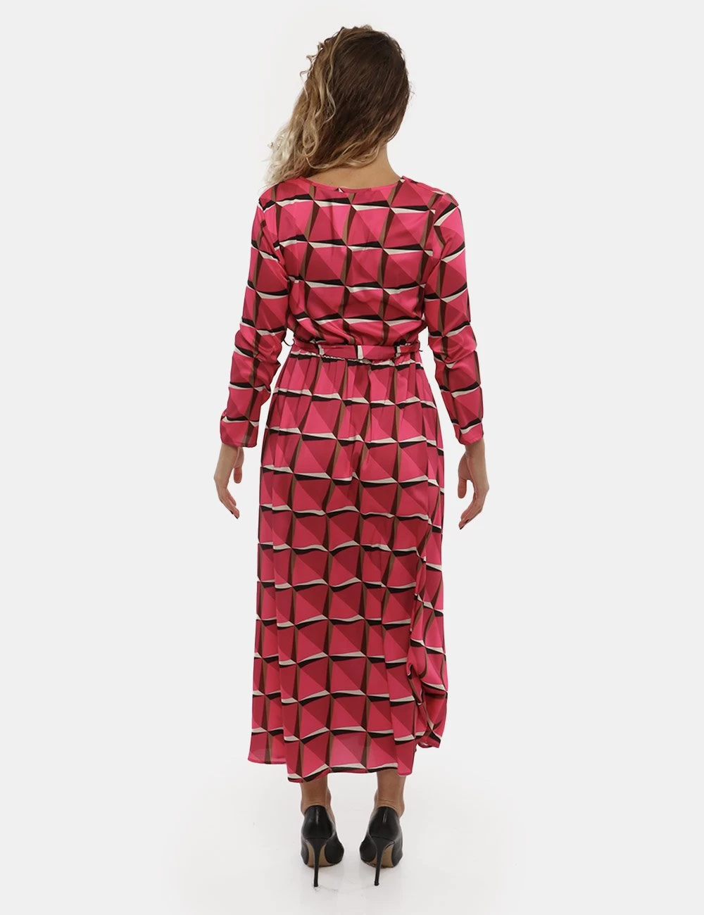 Vestito lungo stampato con fantasia geometrica. Scollo a portafogli. Arricciato in vita. Con passanti per cintura. Una ventata di fantasie anni ’70 da esaltare con un bel paio di stivali texani e una giacca in scamociato. Un look favoloso!