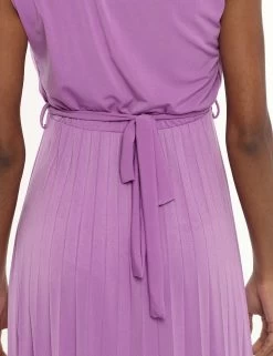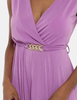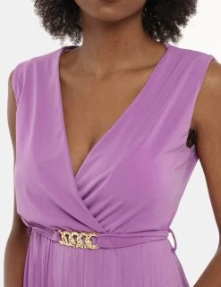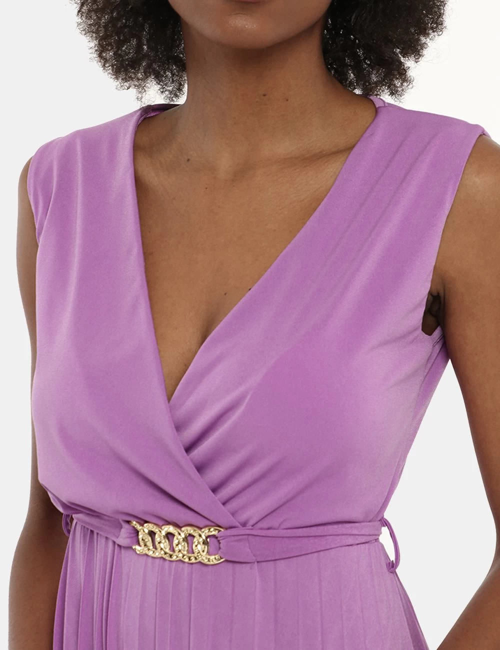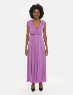 Vestito lungo elegante in total viola tonalità ciclamino. Il capo gode di spalline larghe con scollo profondo più gonna plissettata. La vestibilità è morbida e regolabile grazie a cinturetta in stoffa in girovita con dettaglio dorato che dona luce al capo. Il vestito è adatto per occasioni raffinate e ideale per outfit serali. Indossalo e preparati alle vibrazioni del fine settimana.