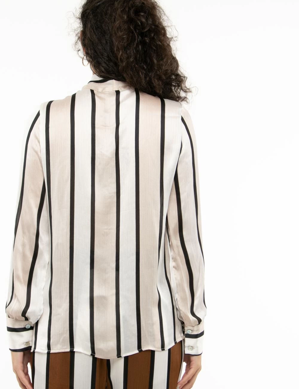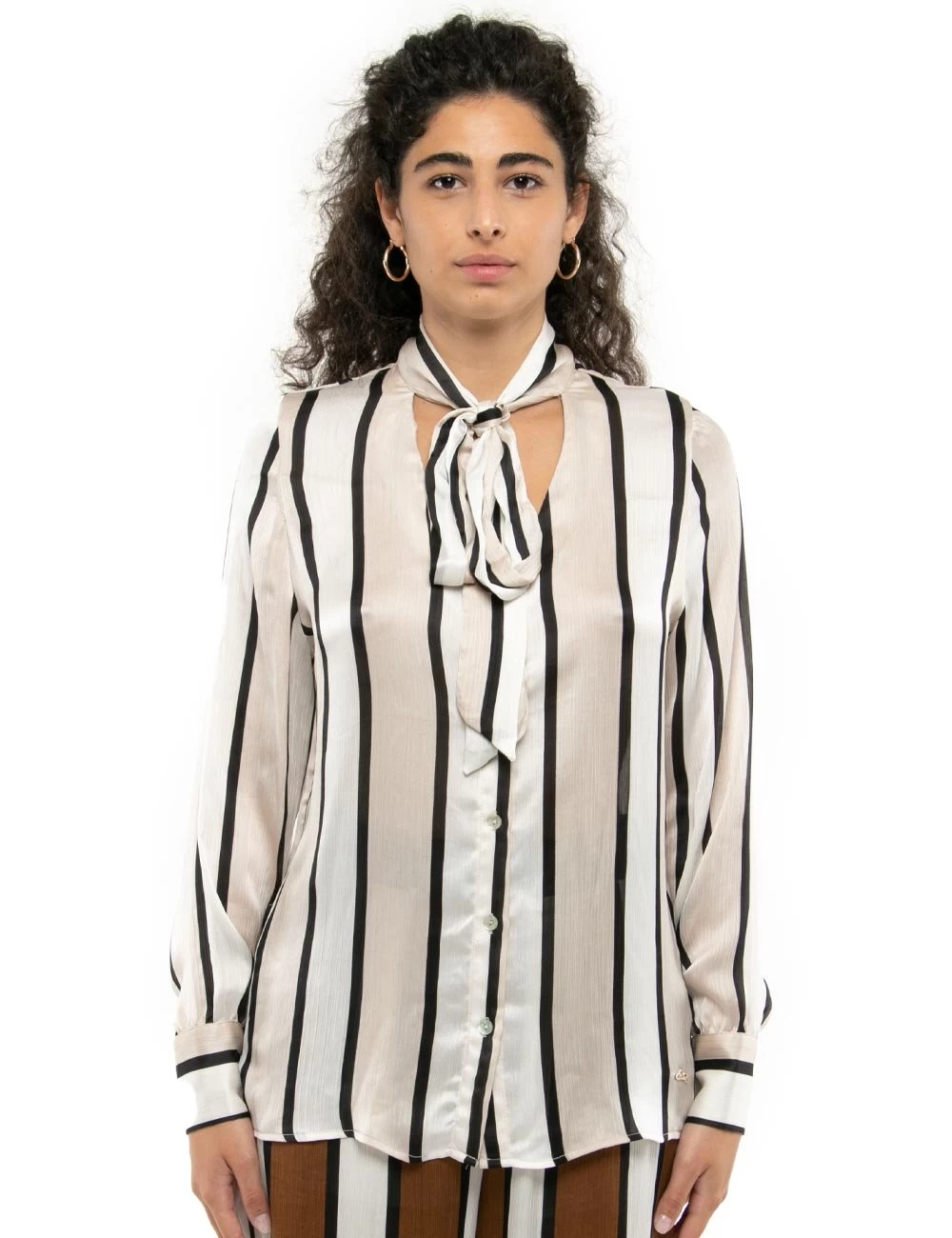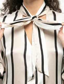 Le righe di questa camicia sono solo il tocco di stile di un capo unico! A partire dallo scollo a V e dal fiocco attorno al collo. Abbinala a un pantalone scuro che richiami le righe e sarai perfetta per un aperitivo in riva al lago!