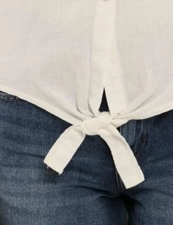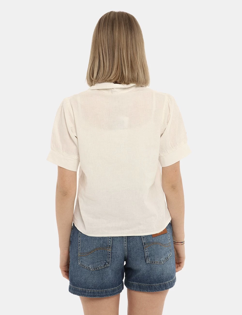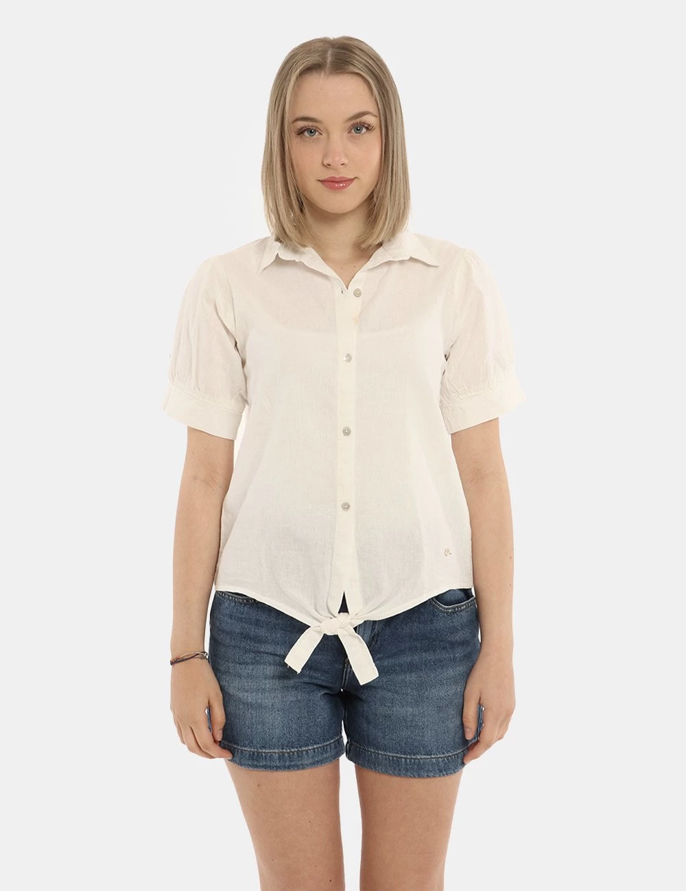 Camicia a maniche corte in total bianco panna. Presente colletto classico e piccoli laccetti in tinta annodati ad altezza ombelico. La vestibilità è morbida e pratica grazie a bottoni ad asola in tinta sul fronte. La camicia è adatta per occasioni casual e facilmente combinabile per outfit diurni. Il tuo prossimo articolo nei prodotti salvati.