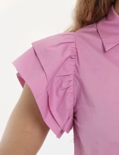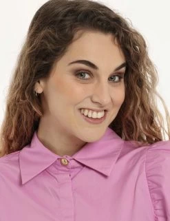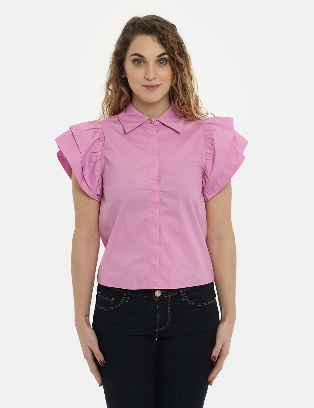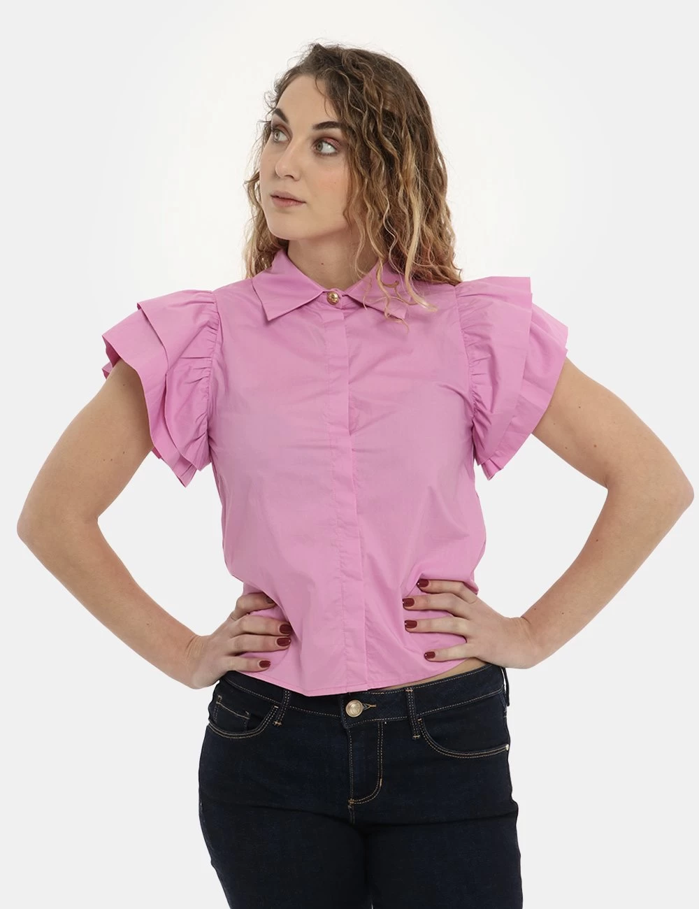 Camicia a maniche corte arrichite da volant in total rosa shocking. La vestibilità è asciutta ma pratica grazie a bottoni ad asola in tinta sul fronte. La camicia è adatta per occasioni casual/raffinate facilmente combinabile per outfit diurni e serali magari con un blazer abbinato. Amore al primo scroll.