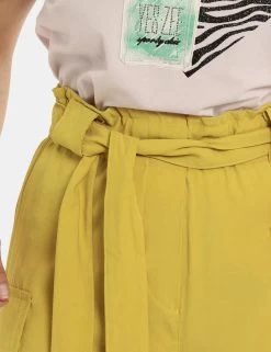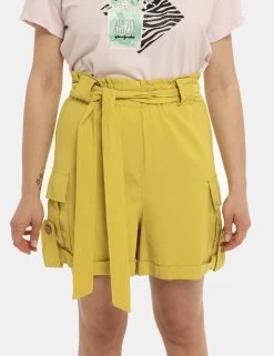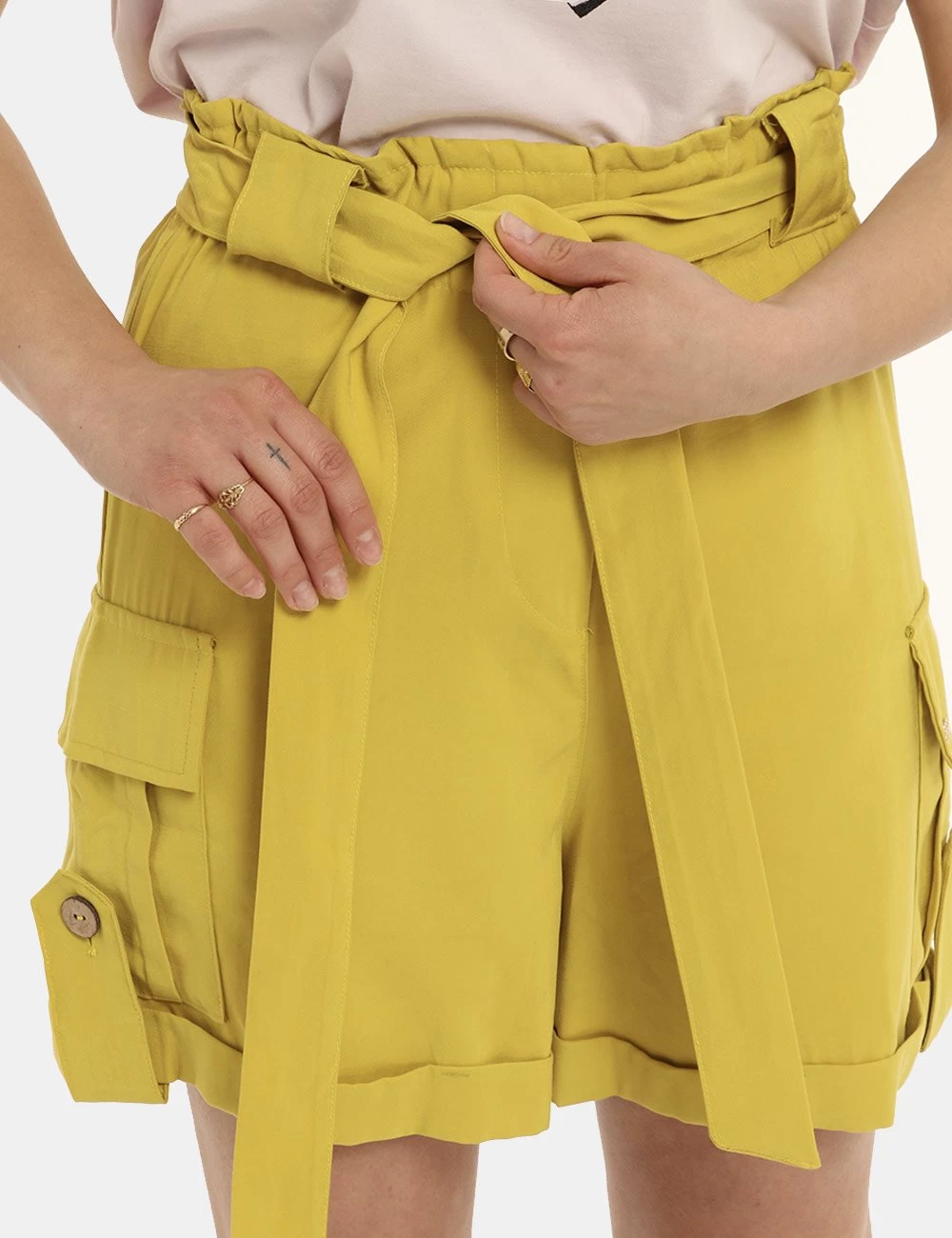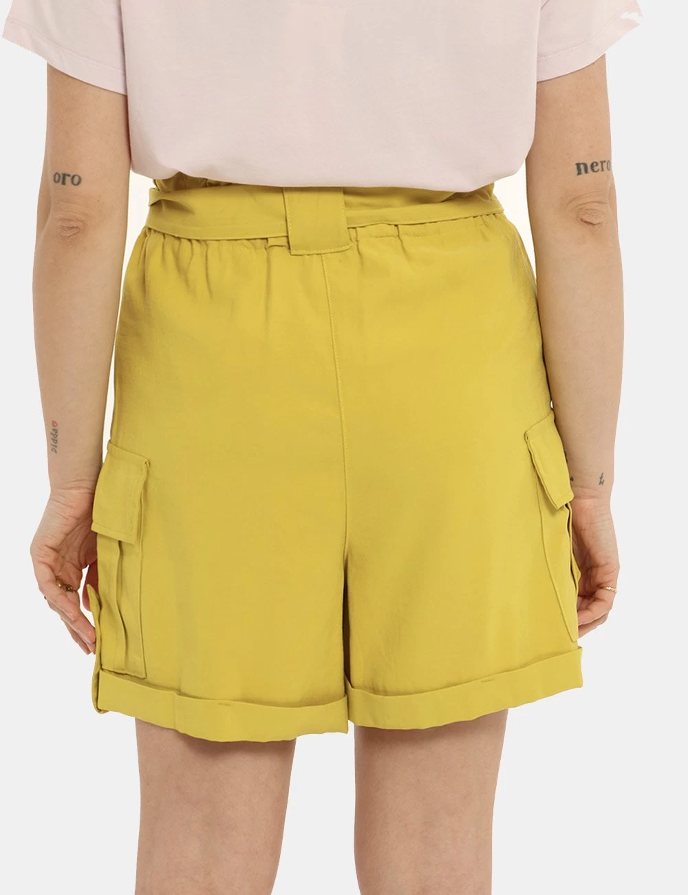 Short in total giallo ocra con risvoltino con tasche a toppa laterali. La vestibilità è morbida e regolabile grazie ad elastico in girovita con cintura in tessuto ed in tinta. Gli short sono adatti per occasioni casual e facilmente combinabili per outfit diurni. Il tuo prossimo articolo nei prodotti salvati.