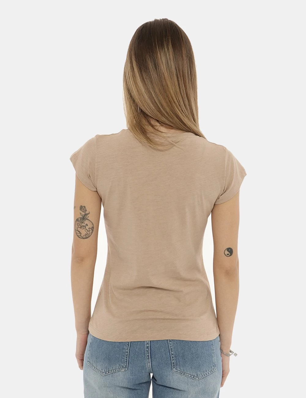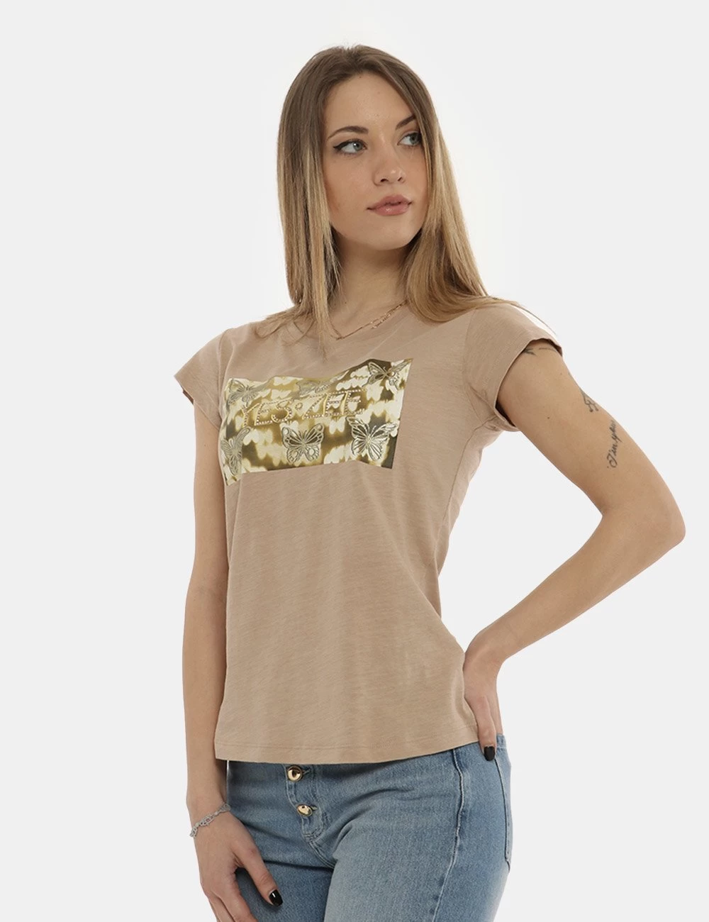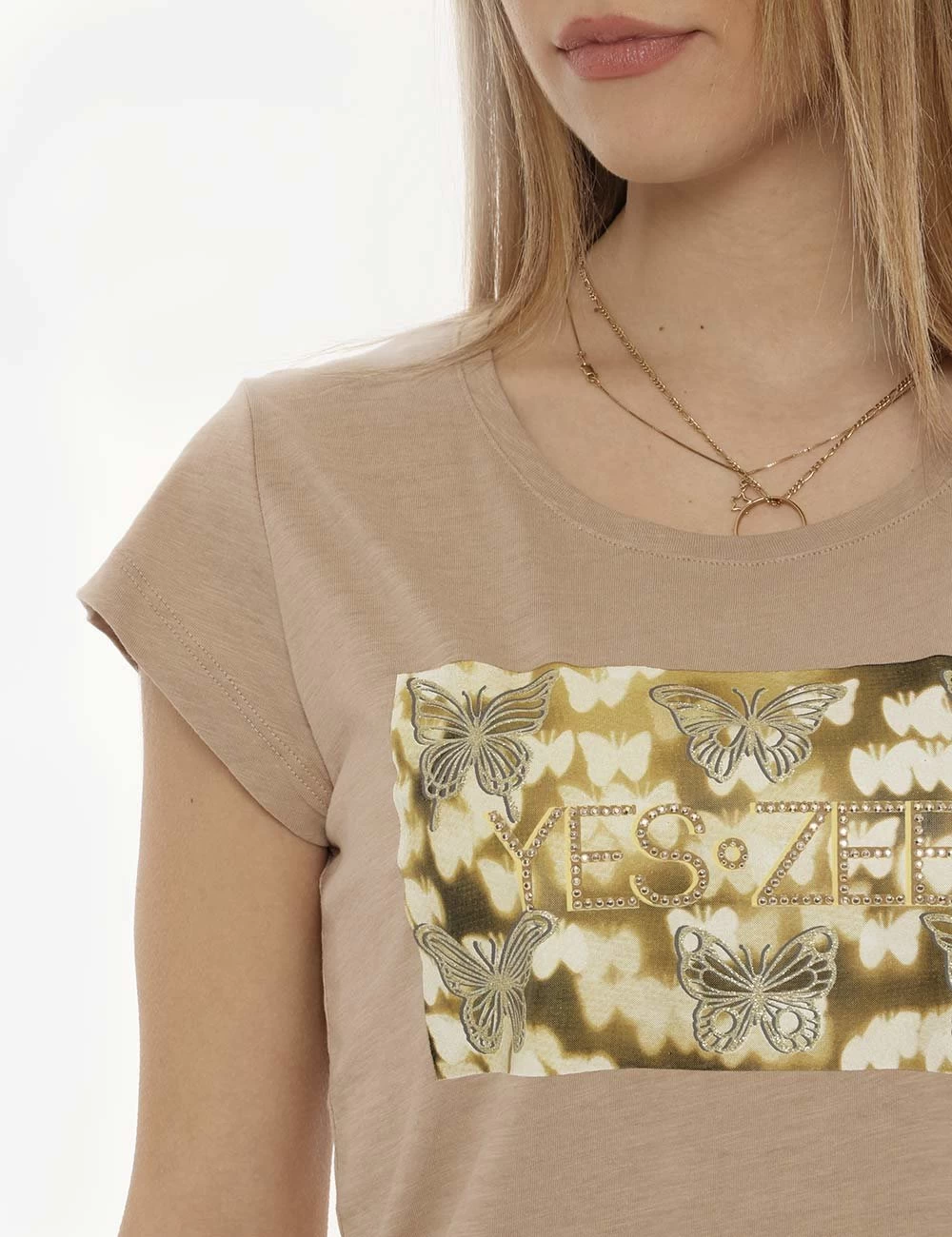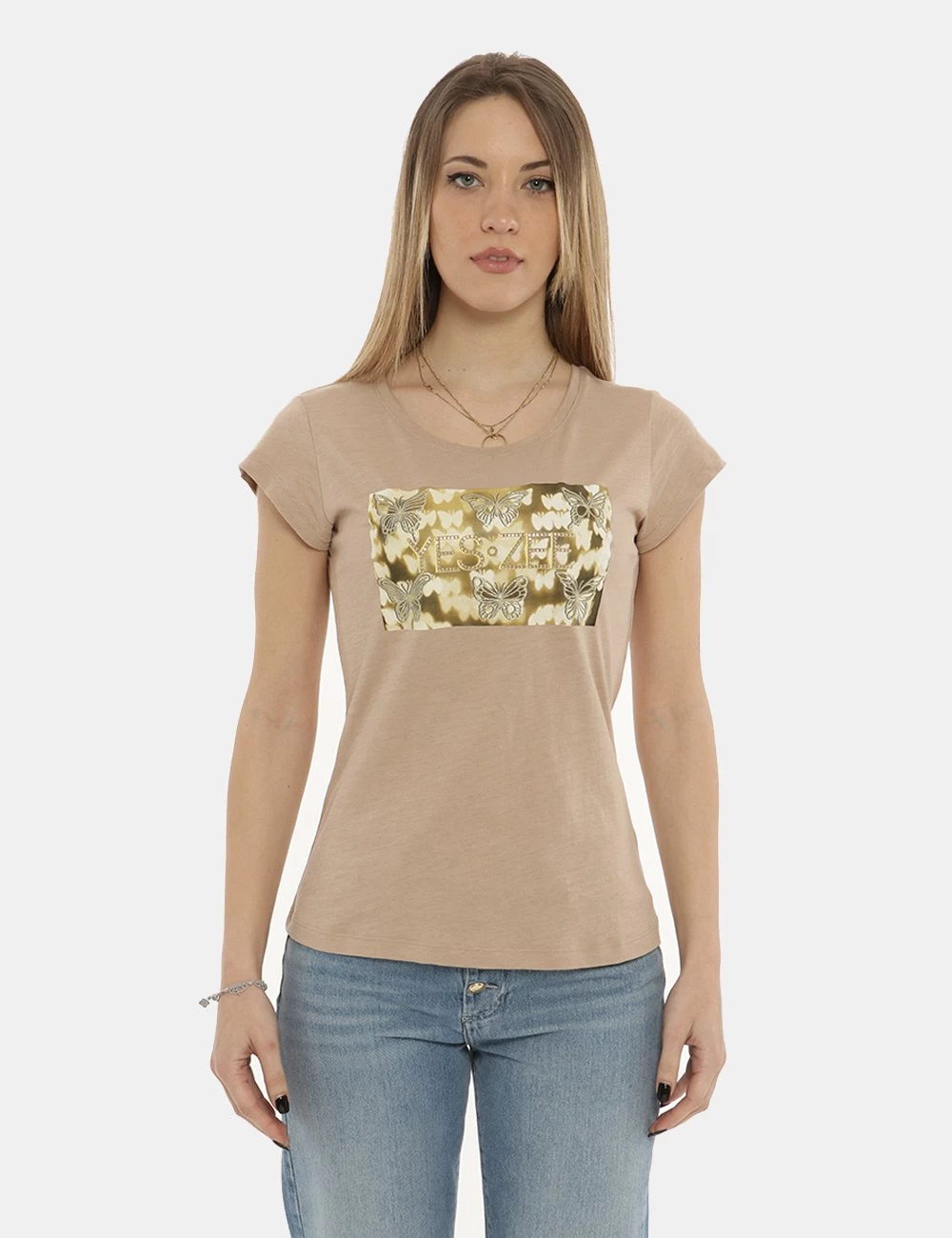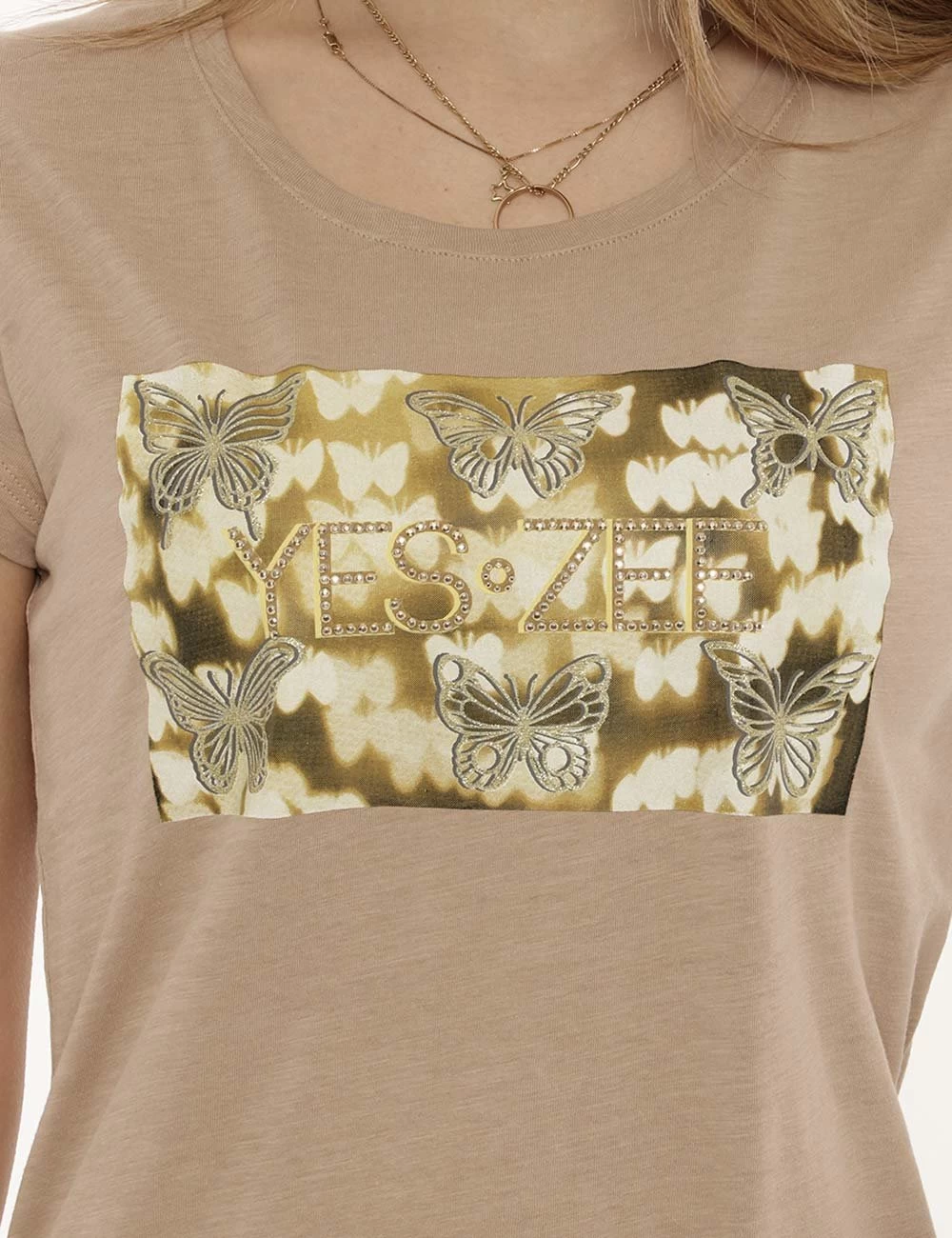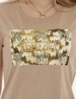 T-shirt da donna Yes Zee. Il capo si sviluppa su sfondo beige scuro e presenta stampa centrale rettangolare con farfalle e logo brand in tinta dorata più glitter. La vestibilità è morbida e priva di allacciature. La t-shirt è ideale per outifit diurni e di sera. Inseriscila nel carrello se vuoi fare un “figurone”.