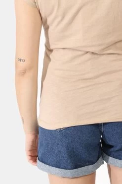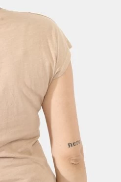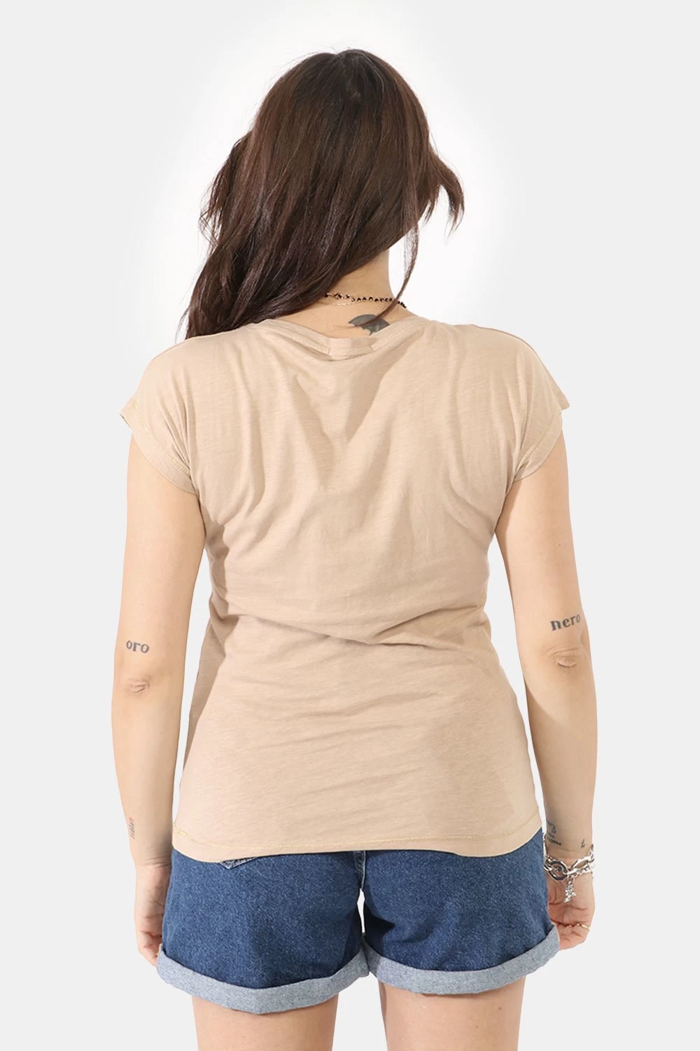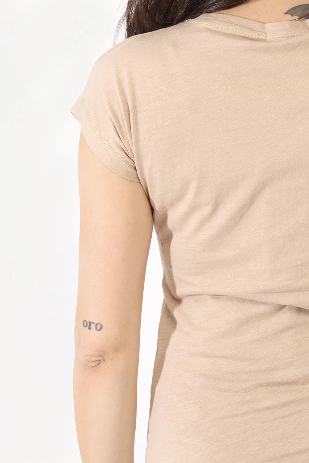 T-shirt a giromanica su sfondo beige con cuciture evidenziate in tinta oro. Presente stampa centrale con logo brand in glitter coordinati. La vestibilità è morbida e regolare. La t-shirt è adatta per occasioni casual e facilmente combinabile per outfit diurni e serali. Semplicità e stile in un solo capo.