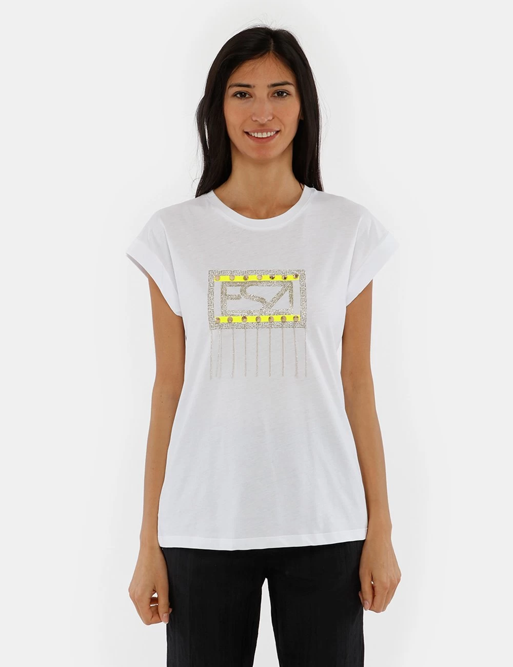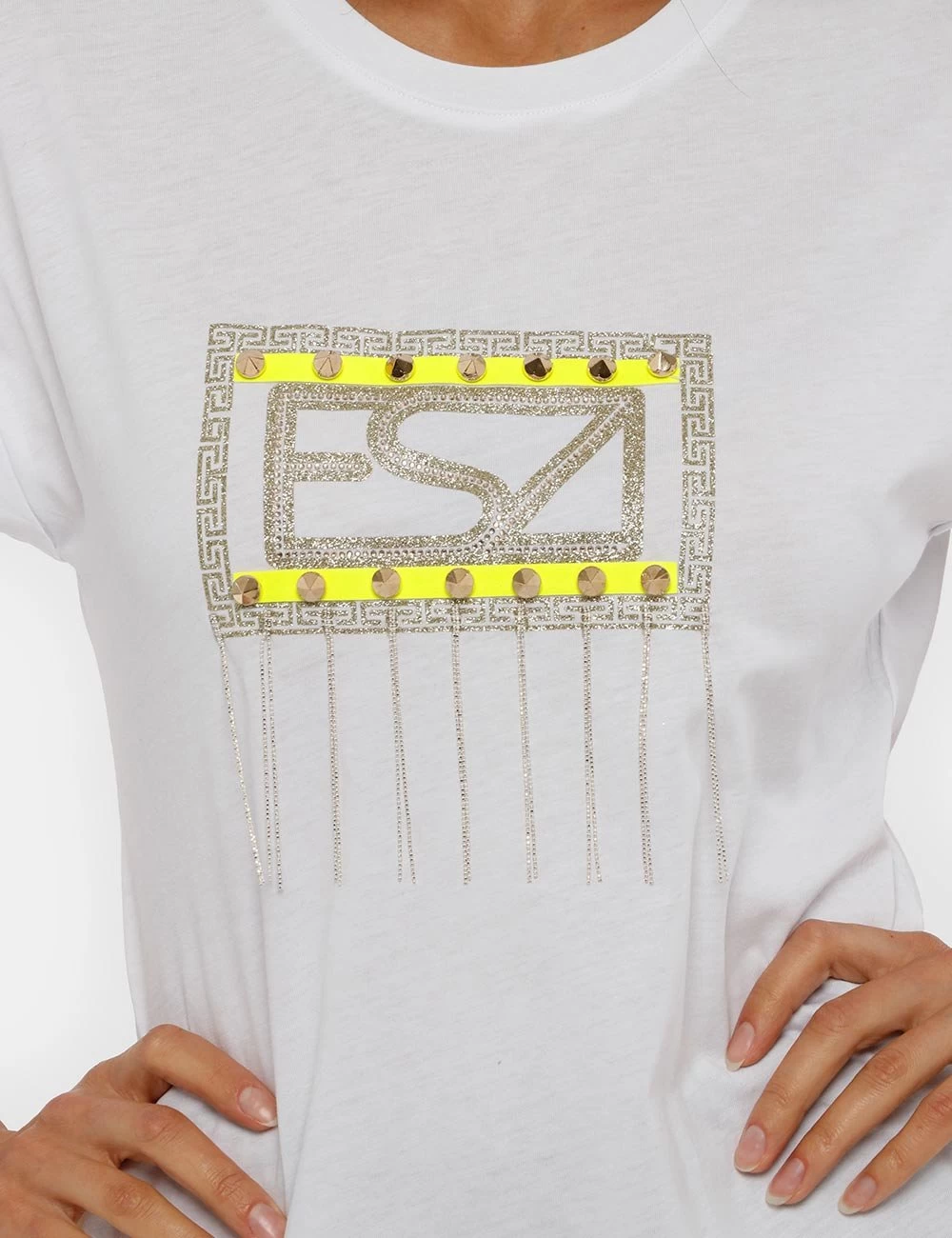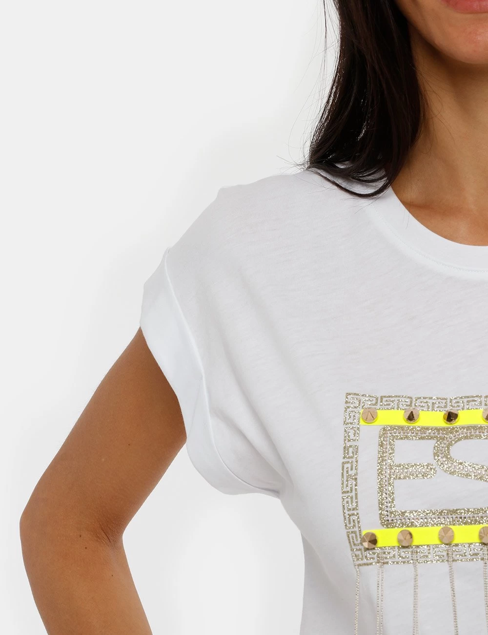 Per rifinire i tuoi look sporty-chic scegli questa t-shirt con glitter e applicazioni: borchie e catenelle rendono il capo unico! Perfetta sopra a un paio di jeans