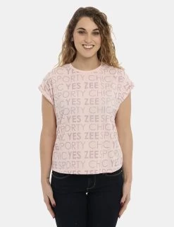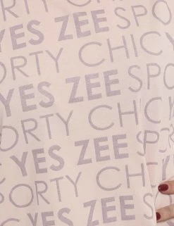 T-shirt giromanica su sfondo rosa chiaro con stampa allover “Yes Zee” in glitter lilla. Il capo ha una vestibilità asciutta ma regolare. La t-shirt è adatta per occasioni casual facilmente combinabile per outfit diurni e serali. Forte professionale piacevolmente chic.