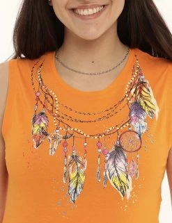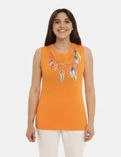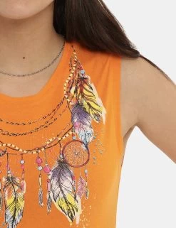 Top canotta su sfondo arancione con stampa “acchiappasogni” in varie tonalità di rosa giallo e viola più glitter coordinati. La vestibilità è morbida e regolare. Il top è adatto per occasioni casual. Dona colore al tuo guardaroba.