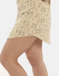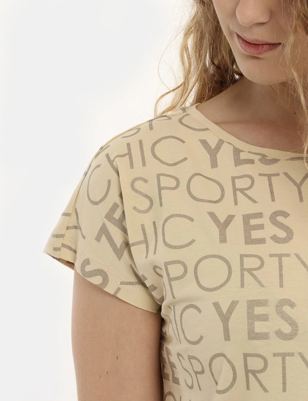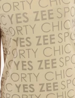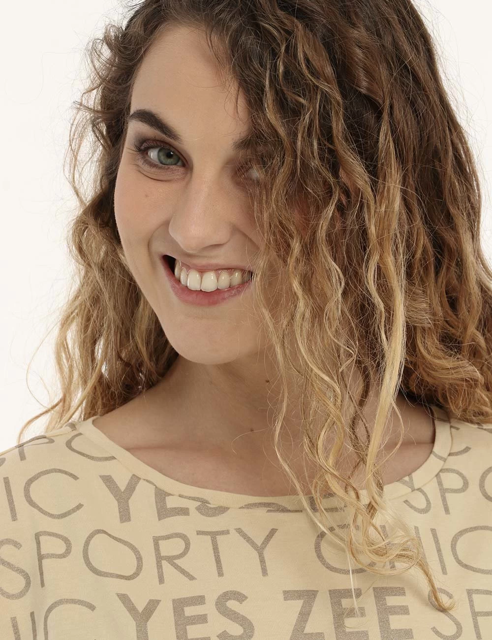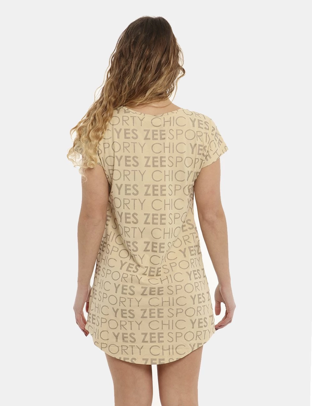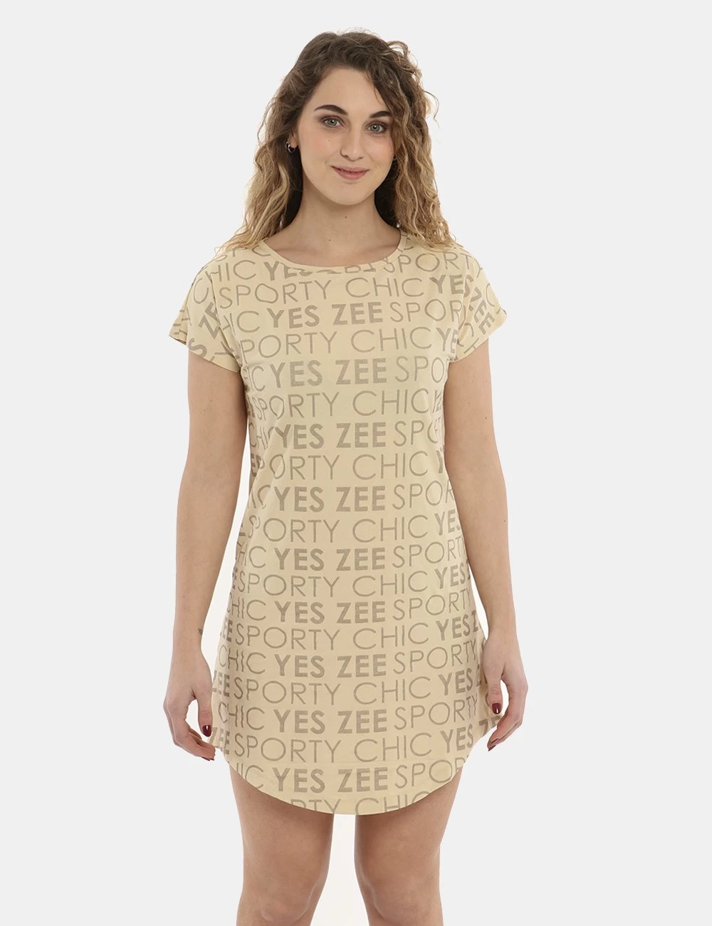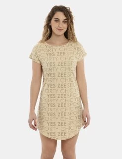 Vestito lineare a giromanica su sfondo beige con stampa allover “Yes Zee” in marrone. La vestibilità è asciutta ma regolare. Il vestito è adatto per occasioni casual. Praticità e stile in un solo capo.