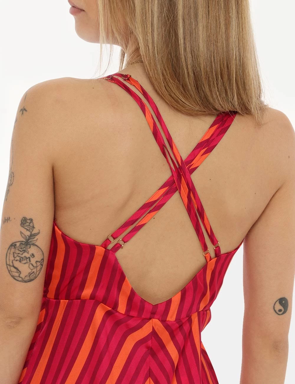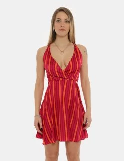 Il vestito Yes Zee si presenta su sfondo rigato verticale in differenti varianti fuxia. Sul fronte gode di un particolare intreccio che dona al capo ricercatezza. La vestibilità è morbida e regolabile grazie a spalline con piccola fibia in tinta dorata ma anche pratica grazie a zip laterale. L’abito è ideale per outfit casual e raffinati. Se vuoi spiccare fallo tuo.